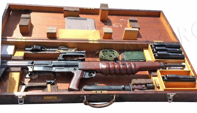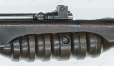 AN OPTICAL SIGHT, AND THE WOODEN STOCK HAS BEEN ELIMINATED. IN THE BACKGROUND IS